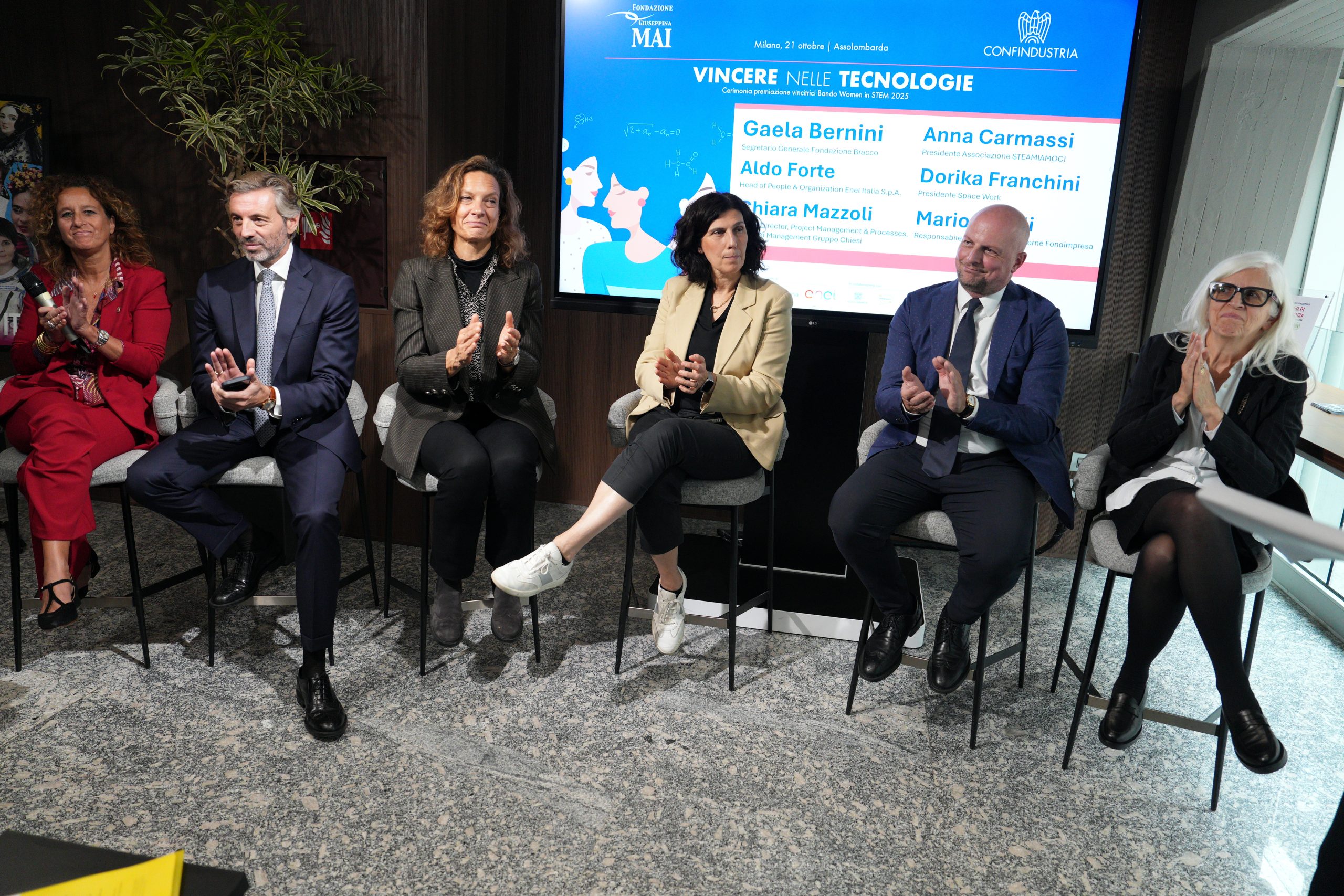 Milano, 21 ottobre, premiazioni delle vincitrici del Bando Women in Stem. Nella foto, da sinistra: Dorika Franchini, Presidente Space Work; Aldo Forte, Head of People & Organization Enel Italia S.p.A.; Gaela Bernini, Segretario Generale di fondazione Bracco; Chiara Mazzoli, Senior Director, Project Management & Processes, Portfolio Management Gruppo Chiesi; Mario Moioli, Responsabile Area Relazioni Esterne Fondimpresa; Anna Carmassi, Presidente STEAMiamoci