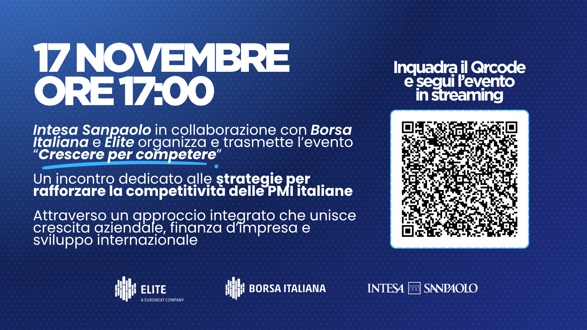Confindustria segnala l’evento “Crescere per competere”, promosso da Intesa Sanpaolo in collaborazione con Borsa Italiana ed ELITE. L’appuntamento, in programma lunedì Lunedì 17 novembre 2025 alle 17:00, è dedicato alle imprese italiane e focalizzato sulle strategie per rafforzarne la competitività in un contesto economico in continua evoluzione.