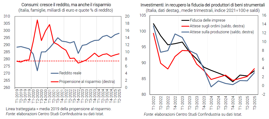 Consumi in miglioramento. Nel 2° trimestre il reddito reale totale delle famiglie è cresciuto (+0,3%), ma l’aumento del tasso di risparmio (al 9,5%), legato all’incertezza, ha frenato la spesa. Sembra meglio il 3°: l’occupazione registra una pausa in agosto, come le vendite al dettaglio, ma per entrambe la variazione acquisita trimestrale è positiva (+0,1% e +0,3%); a settembre la fiducia delle famiglie recupera in parte (96,8 da 96,2) e le vendite di autoveicoli tornano infine a crescere in termini annui (+0,4%).
