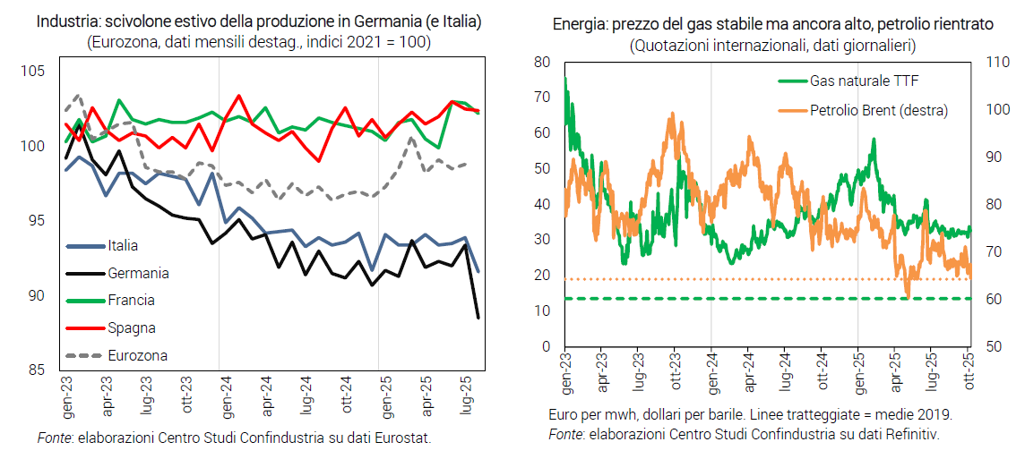 Evidente l’impatto dei dazi. La recente tregua tra Israele e Palestina attenua l’incertezza e il rientro del prezzo del petrolio abbassa i costi. In Italia c’è qualche segnale positivo per gli investimenti, ma nel 3° trimestre l’industria è ancora in difficoltà e i servizi continuano a crescere poco. Dazi USA e dollaro svalutato continuano a erodere l’export, mentre il risparmio precauzionale frena i consumi.