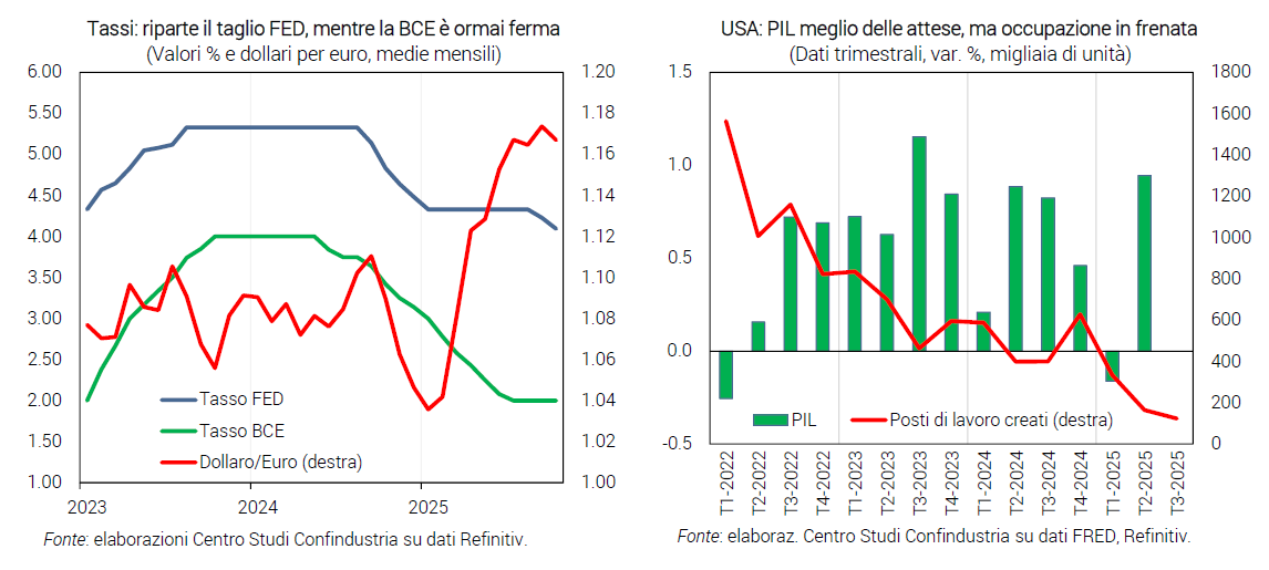 BCE ferma. L’inflazione resta bassa nell’Eurozona (+2,2% a settembre), ma la BCE non sembra avere intenzione di tagliare i tassi ulteriormente (2,00% da giugno). La FED ha ripreso i tagli (4,25% a settembre) ed è attesa proseguire. Il dollaro per ora rimane svalutato sull’euro: 1,17 in media a ottobre, da 1,04 a gennaio (+12,7%), riflettendo le peggiori attese sull’economia USA legate ai dazi.