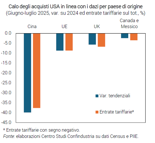 Import USA dalla UE in calo. Dazi ed euro forte sul dollaro (che essi stessi hanno determinato) penalizzano molto la competitività di prezzo dei beni europei negli USA, soprattutto rispetto alle produzioni domestiche americane, e anche nel resto del mondo. Gli acquisti USA dalla UE si sono ridotti dell’8,7% annuo in giugno-luglio. Una dinamica peggiore di quella, piatta, per il totale dell’import USA, che è stato ancora sostenuto dall’aumento degli acquisti da alcuni paesi asiatici (Cina esclusa), per anticipare il rialzo dei dazi reciproci in agosto (frontloading). Il calo dell’import USA dalla UE e da altri importanti paesi fornitori risulta di entità simile, in valore assoluto, al livello effettivo dei dazi sui prodotti: gli acquisti dalla Cina sono crollati del 39,9% in giugno-luglio, con una tariffa media applicata del 37,7%. I flussi da UK e paesi USMCA (Canada e Messico) si sono ridotti di meno, grazie a dazi effettivi più moderati, minori della media mondiale. Il calo degli acquisti USA dai principali fornitori è il risultato di una contrazione sia dei volumi sia dei valori medi unitari dei prodotti importati, che segnala un possibile adeguamento parziale dei prezzi da parte degli esportatori per mitigare le tariffe e, in generale, una ricomposizione dell’import a favore di prodotti di minore valore unitario.