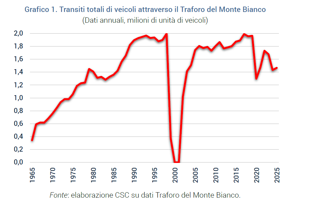 Il collegamento tra Italia e Francia attraverso il Traforo del Monte Bianco rappresenta un’infrastruttura cruciale per l’economia della Valle d’Aosta, del Nord-Ovest italiano e, più in generale, per i flussi commerciali tra Italia e Francia. Attraverso il tunnel transitano quote rilevanti dell’export regionale (nel 2024 circa 168,6 milioni di euro, pari al 20,5% dell’export regionale verso il mondo, quasi esclusivamente manifatturiero), flussi turistici chiave – in particolare dalla Francia e dalla Svizzera francofona – e una parte significativa delle merci importate dalla Francia (39,8 milioni di euro, l’8% del totale). Nel 2019, ultimo anno pre-pandemico e senza chiusure, si sono registrati quasi 2 milioni di passaggi, tra auto, moto, camion e pullman. Anche brevi interruzioni o chiusure parziali negli anni recenti hanno già prodotto cali significativi dei transiti.