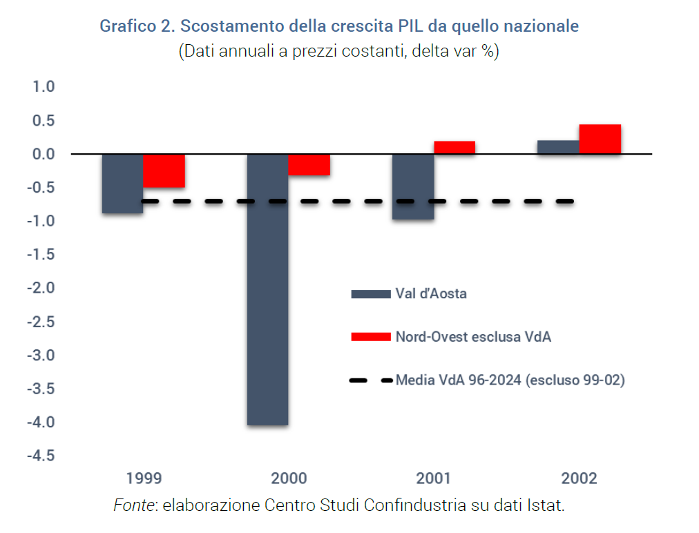 In una prospettiva storica più ampia, l’andamento del valore aggiunto regionale della Valle d’Aosta tende ad essere piuttosto simile a quello del Nord-Ovest e del Piemonte, con alcune eccezioni. Le più rilevanti sono nel 1997, appunto nel 2000 per la chiusura del Traforo, nel 2004 (fine dei fondi per la ricostruzione post-alluvione del 2000), nel 2013 e nel 2016 (effetto ritardato della crisi dei fondi sovrani e successiva recessione). Tra questi, lo scostamento negativo osservato nel 2000 ha toccato il 3,7% rispetto al Nord-Ovest (e 4,1% rispetto all’intera Italia), il secondo più alto se si considera l’intero periodo 1995-2024. Anche prendendo in esame il prodotto interno lordo regionale si osserva lo stesso fenomeno: nel periodo 1999-2001 lo scostamento cumulato tra il PIL della Valle d’Aosta e quello italiano è di -5,1%, il peggiore registrato in tutta la penisola. Si tenga conto che il secondo peggiore (Basilicata) è stato di oltre 2 punti percentuali più basso (-2,9%) e che quello del Nord-Ovest (esclusa la Valle d’Aosta) è stato pari a -0,1% (Grafico 2). Un’anomalia che sembra dovuta agli effetti di un evento specifico occorso a livello regionale in quel periodo, appunto la chiusura del Traforo.