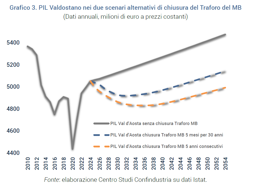 L’analisi storica dimostra chiaramente la vulnerabilità economica della regione rispetto a interruzioni prolungate del Traforo. Tra il 1999 e il 2002, in seguito all’incendio che ne causò la chiusura, la Valle d’Aosta registrò un rallentamento significativo della crescita economica: il PIL regionale risultò inferiore del 5,1% rispetto al trend nazionale, con una perdita stimata attribuibile alla chiusura pari a circa -2,3% del PIL. La chiusura determinò una deviazione molto persistente dei flussi di traffico verso altri valichi alpini e un calo delle presenze turistiche francesi e straniere, con conseguenze negative sull’economia locale.