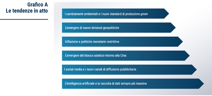 Vendite online, stoccaggio sempre più massivo di informazioni su piattaforme digitali, riduzione degli spostamenti fisici delle persone, affiancamento dei social media ai mass media sono alcuni dei fenomeni che, da oltre 25 anni e maggiormente con la pandemia, continuano a crescere d’intensità e di importanza, ponendo sfide inedite ai modelli di produzione e di vendita. In primis, diviene cruciale la rapidità di adattamento richiesta alle imprese come fattore di resilienza per continuare a operare sui mercati internazionali. Il cambiamento tecnologico ha fatto, inoltre, emergere colossi e giganti del web che operano su scala globale con posizioni di rendita monopolistiche difficilmente scalfibili, almeno nell’immediato, da altri operatori economici (Grafico A).