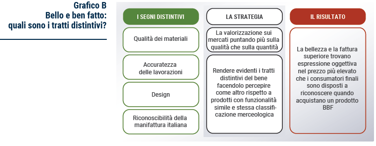 La facilità di riconoscere l’italianità come caratteristica di un prodotto e di apprezzarla si è affermata nel tempo in tutto il mondo, motivo per cui i consumatori sono disposti a riconoscere un valore superiore a un bene made in Italy piuttosto che a quello prodotto da un competitor, e di conseguenza a pagare di più per averlo. Il BBF e i suoi tratti distintivi sono la bandiera dell’italianità nel mondo (Grafico B). Questa categoria di prodotti racchiude in sé tutti quei beni che rappresentano l’eccellenza italiana in termini di design, cura nei dettagli, qualità dei materiali e delle lavorazioni. Si tratta di prodotti di elevata qualità che si distribuiscono in tutti i comparti produttivi, e che trovano la loro massima espressione nelle produzioni maggiormente legate al gusto e alla creatività. Da questo punto di vista il BBF è l’espressione più facilmente riconoscibile del made in Italy, riprendendo i tratti più caratteristici dell’ heritage culturale dell’Italia, delle sue tradizioni, dei suoi paesaggi e delle sue opere d’arte, contribuendo a comporre l’immagine dell’Italia produttiva. In questo senso il “bello e ben fatto”, oltre a rappresentare una quota importante dell’export italiano nel mondo, fa da volano a tutte le esportazioni italiane, avendo un valore non solo economico, ma anche immateriale.