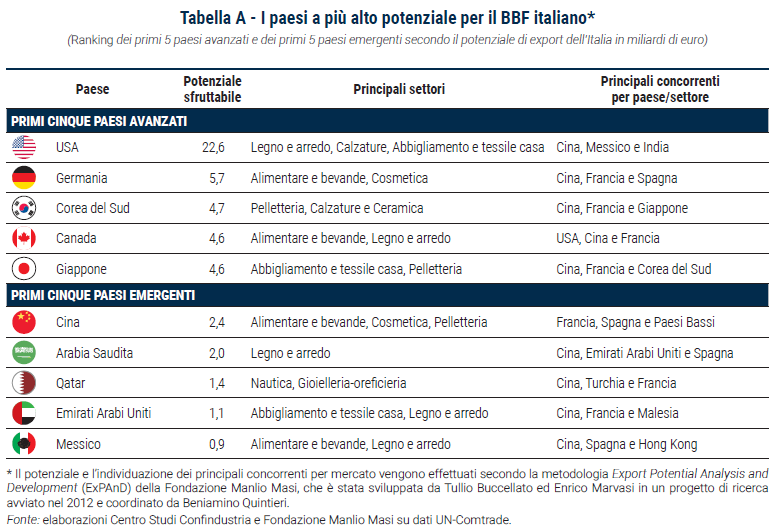 L’analisi contenuta nel Rapporto consente di ottenere una misura del potenziale dell’export italiano nell’ambito del BBF, rispetto alla quale valutare il margine di miglioramento delle posizioni fin qui acquisite. Il potenziale è calcolato valutando il possibile ampliamento delle attuali quote di mercato rispetto a quelle dei concorrenti che, per struttura dei costi di produzione e qualità dei prodotti esportati, hanno caratteristiche simili a quelle dell’Italia. Il potenziale si ripartisce per oltre tre quarti nei paesi avanzati (74 miliardi di euro) e per la restante parte negli emergenti (22 miliardi di euro).
