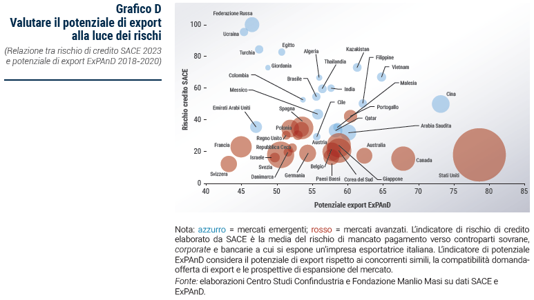 Le tensioni internazionali legate al conflitto in Ucraina, l’aumento dei prezzi e le politiche monetarie restrittive hanno contribuito a deteriorare il quadro economico globale che ancora scontava gli effetti negativi legati alla crisi pandemica. L’insieme di questi fattori ha causato un indebitamento più elevato sia per il settore pubblico sia per quello privato che, a loro volta, hanno indotto un peggioramento generalizzato nel rischio di credito. Per comprenderne le implicazioni, l’analisi del potenziale si accompagna a quella del rischio che ciascun mercato presenta (Grafico D). Non sorprende il posizionamento così elevato di Russia e Ucraina nella scala di rischio di credito essendo i due paesi direttamente coinvolti nel conflitto. Rimangono piuttosto sicuri i paesi avanzati, che peraltro rappresentano la destinazione più rilevante per le esportazioni di BBF, dove le economie più strutturate stanno consentendo, nonostante le difficoltà, una maggiore stabilità.