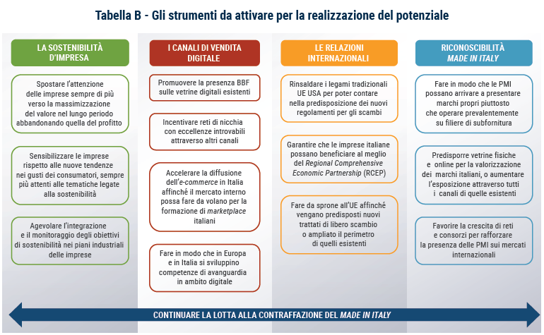 In un mondo sempre più connesso e dove il commercio online continua a crescere rapidamente, rafforzare i canali di vendita digitale, sia che implichi promuovere la presenza del BBF sui canali esistenti, sia che significhi farlo su nuovi, è di vitale importanza. Non presidiando questi “mercati virtuali” si accumulerebbe uno svantaggio competitivo difficile, se non impossibile, da colmare. Tramite questi canali, ma non solo, è possibile promuovere la creazione di marchi anche per le piccole e medie imprese italiane. La riconoscibilità del made in Italy potrebbe inoltre essere valorizzata incoraggiando la creazione di reti e consorzi di imprese volti a estrarre maggior valore dalle catene globali del valore e miranti a superare il sottodimensionamento dell’imprenditoria italiana in molti comparti.