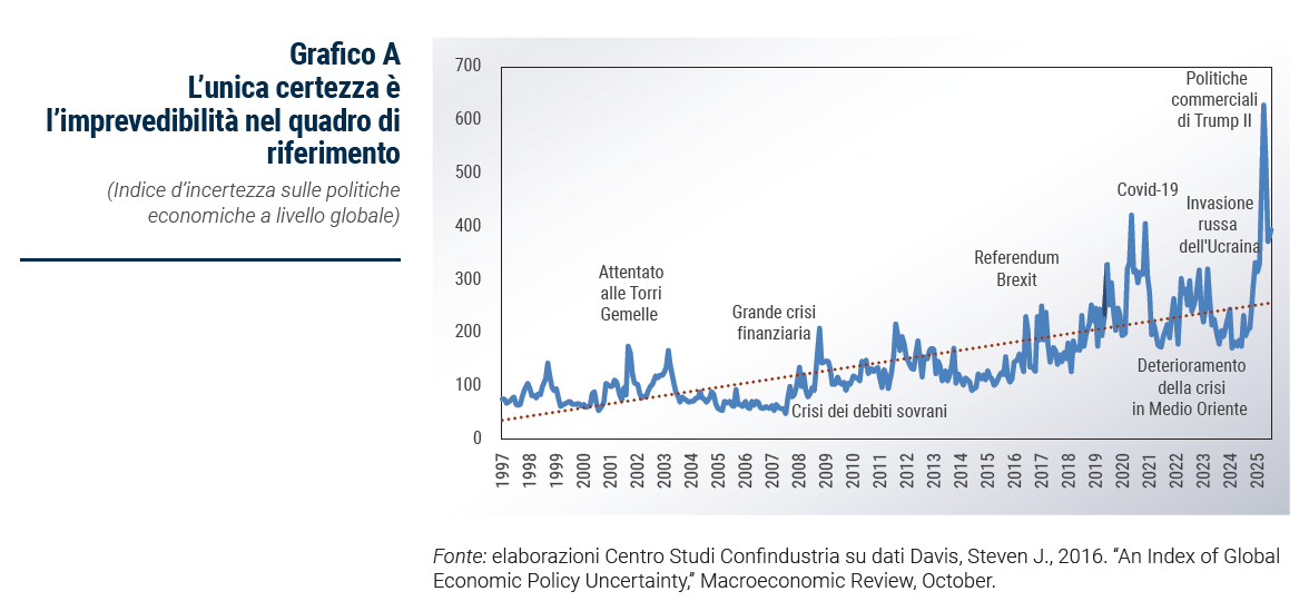 La realizzazione del potenziale passa per il rafforzamento della capacità produttiva e dipende anche dalle scelte di policy Il fatto che ci siano ampi margini di miglioramento per l’export italiano non significa che la sua realizzazione sia automatica. Aumentare le esportazioni implica a monte un incremento della produzione, che a sua volta passa per una crescita degli investimenti. A tal fine è necessario uno sforzo coordinato di imprese e istituzioni per favorire un irrobustimento generalizzato del sistema produttivo italiano e della sua competitività lungo vari assi. Se da un lato le imprese dovrebbero impegnarsi nel destinare risorse a investimenti produttivi, dall’altro le istituzioni dovrebbero spronare questo processo attraverso la mitigazione degli elementi di incertezza che condizionano le scelte di investimento da parte delle imprese.