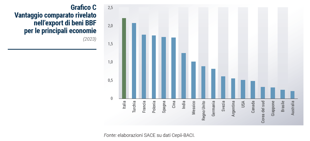 La destinazione più importante per l’export potenziale extra-UE sono gli Stati Uniti, con 3,1 miliardi di euro di export potenziale aggiuntivo a fronte di 20,3 già totalizzati nel 2024. Tuttavia, realizzarlo risulterà particolarmente impegnativo a causa delle nuove barriere tariffarie imposte dalla seconda Presidenza Trump. Fondamentali restano i principali partner UE: Germania (2 miliardi a fronte di 18,3) e Francia, primo paese di destinazione del BBF in Europa (1,9 miliardi di potenziale a fronte di 21,7 di export effettivo). Nonostante la Brexit, il Regno Unito resta uno sbocco fondamentale (1,3 miliardi di euro a fronte di 9,5 realizzati). I settori che vi esportano maggiormente sono quelli legati alle “3F”, mentre i concorrenti che più ricorrono sono Francia, Spagna e Cina.