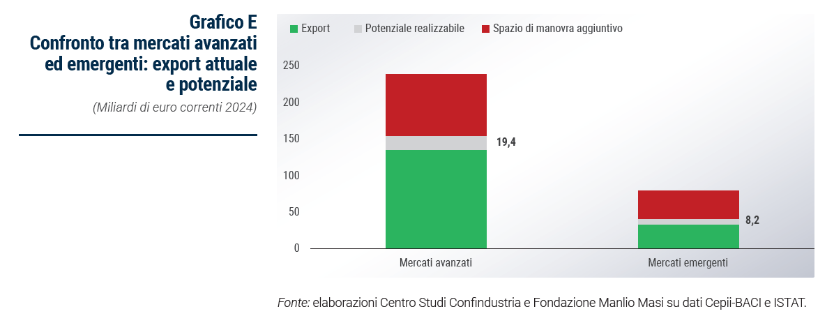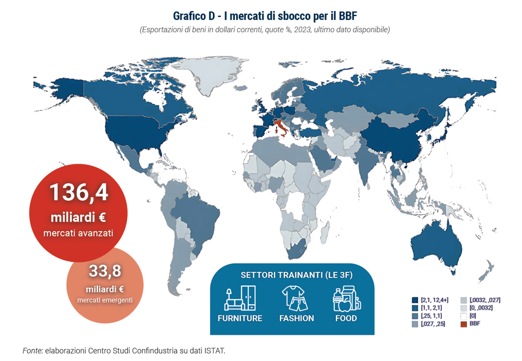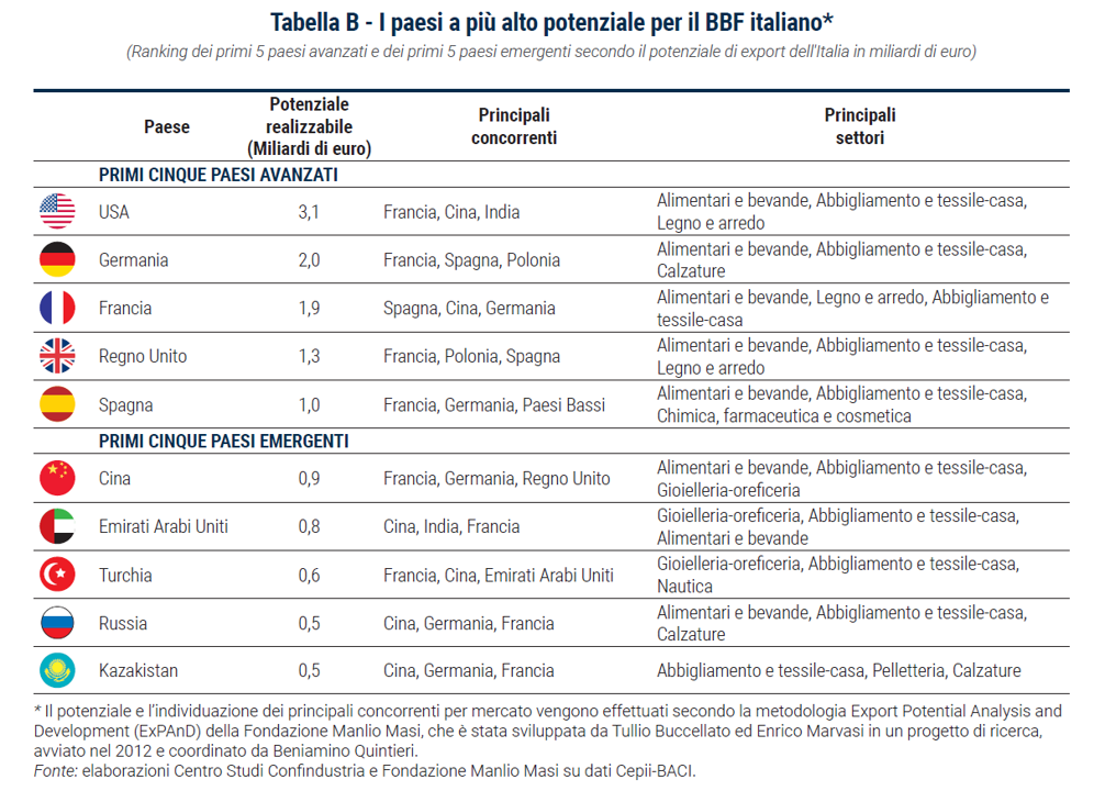 Tra le economie emergenti la Cina si conferma il paese a più alto potenziale per il BBF (quasi un miliardo di euro a fronte di poco più di 5 realizzati nel 2024). Gli Emirati Arabi Uniti sono il secondo (800 milioni di export potenziale aggiuntivo a fronte di 3,9 miliardi già realizzati) seguiti dalla Turchia (600 milioni su oltre 7 miliardi di export effettivo). La Russia è un mercato che si attesterebbe al quarto posto per potenziale sfruttabile nella classifica degli emergenti ma, a seguito dell’invasione dell‘Ucraina, non è realistico pensare a un’intensificazione degli scambi. I settori più fiorenti in questi mercati sono alimentari e bevande, abbigliamento e gioielleria, mentre i tre principali competitor delle imprese italiane sono Francia, Germania e Cina, con quest’ultima che assume un ruolo più evidente.