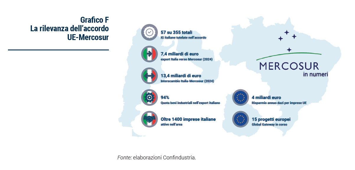 Il perfezionamento dell’accordo Mercosur potrebbe fare da volano per il BBF Per quanto riguarda l’Unione Europea, l’importanza della sottoscrizione di accordi commerciali di libero scambio con paesi ALC è di cruciale importanza per non perdere terreno nei confronti di Stati Uniti e Cina. I negoziati conclusi con successo nel 2024 e la successiva approvazione da parte della Commissione europea nel settembre 2025 per la liberalizzazione del commercio tra UE e blocco Mercosur è un chiaro segnale di come l’Europa punti ad accrescere il proprio ruolo di partner commerciale credibile nei paesi latinoamericani. L’importanza di questo accordo sta nella sua dimensione (Grafico F): quattro paesi che contano circa 300 milioni di consumatori; saranno tutelate 57 indicazioni geografiche italiane su un totale di 355, già più di 1400 imprese italiane sono attive nell’area, l’export italiano verso l’area già si attesta intorno a 7,4 miliardi (dato 2024). I dazi attualmente imposti ai prodotti europei non si esauriscono solamente in un costo d’ingresso ma spesso risultano non monetari e quindi legati a dinamiche protezionistiche poste in essere per specifici settori. Con la sottoscrizione dell’accordo queste barriere all’ingresso verranno eliminate e ciò permetterà alle imprese europee di accrescere il proprio export nell’area.