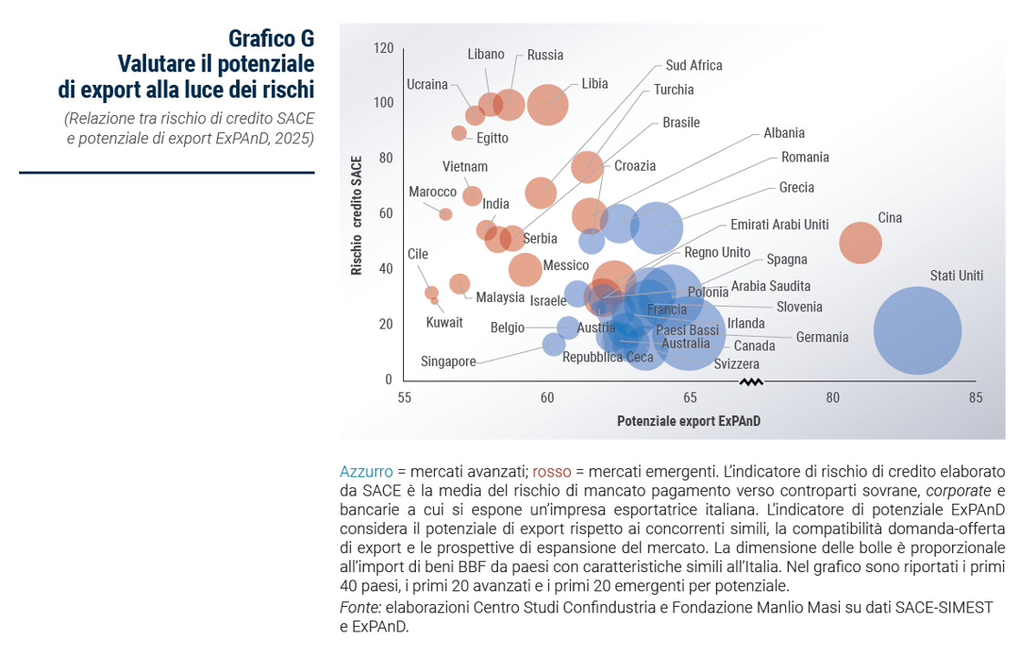 La guerra si conferma come l’elemento di rischio peggiore a livello globale Le tensioni internazionali legate ai conflitti in Ucraina e in Medio Oriente continuano a deteriorare il quadro economico mondiale. I conflitti generano due tipi di effetti: nei territori protagonisti si azzerano le attività economiche (per esempio in Ucraina); in quelli coinvolti subentrano fattori collaterali come divisioni geopolitiche, sanzioni, azioni di business utilizzate a scopi ritorsivi (per esempio con la Russia). Questi fattori spiegano come le tensioni geopolitiche e soprattutto i conflitti armati portino con sé un deterioramento nel rischio di credito. Per comprenderne le implicazioni, l’analisi del potenziale si accompagna a quella del rischio che ciascun mercato presenta (Grafico G). Non sorprende il posizionamento così elevato di Russia e Ucraina nella scala di rischio di credito essendo i due paesi direttamente coinvolti nel conflitto insieme a Libia e Libano. Rimangono piuttosto sicuri i paesi avanzati che, peraltro, rappresentano le destinazioni più rilevanti per le esportazioni di BBF (dimensione delle bolle indicativa dei margini di crescita aggiuntivi per l’export italiano), dove le economie più strutturate stanno consentendo, nonostante le difficoltà legate alle tensioni commerciali, una maggiore stabilità.
