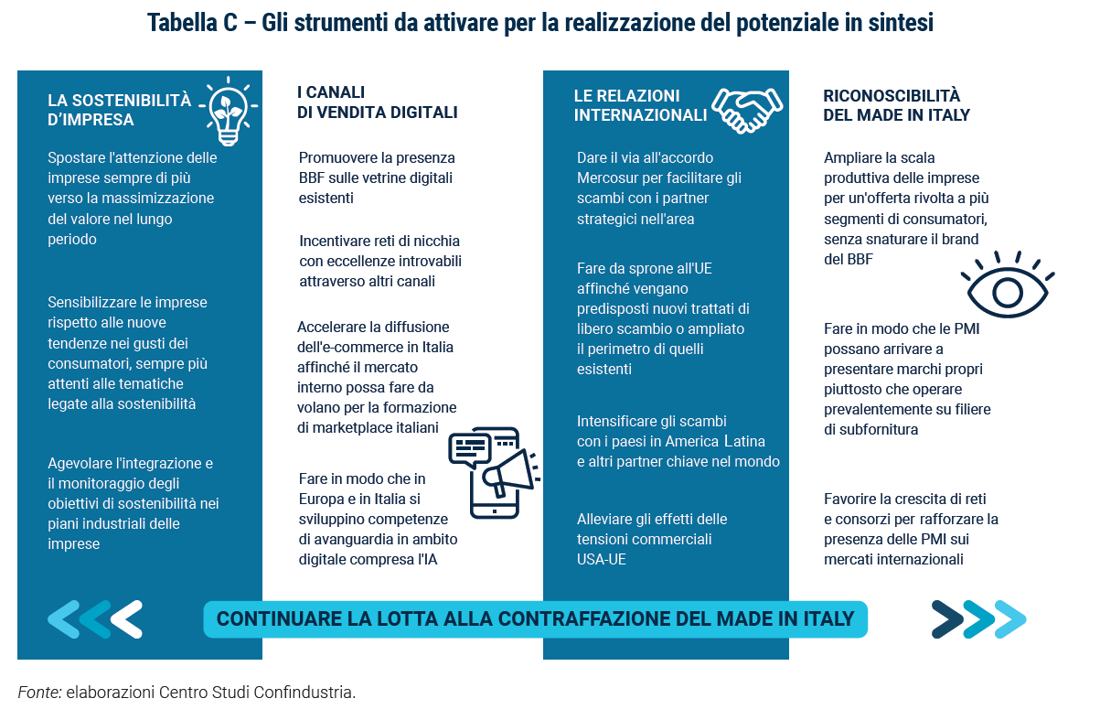 I canali di vendita digitale e la riconoscibilità del BBF rimangono gli strumenti chiave per realizzare il potenziale In un mondo sempre più connesso e dove le decisioni di acquisto vengono prese prevalentemente online (anche se poi materialmente l’acquisto avviene in molti casi in negozi fisici), rafforzare i canali di vendita e pubblicizzazione digitale, sia che implichi promuovere la presenza del BBF sui canali esistenti, sia che significhi farlo su nuovi, è di vitale importanza. Non presidiando queste vetrine virtuali si accumulerebbe uno svantaggio competitivo difficile, se non impossibile, da colmare. Tramite questi canali è possibile promuovere la creazione di marchi anche per le piccole e medie imprese italiane. La riconoscibilità del Made in Italy potrebbe inoltre essere valorizzata incoraggiando la creazione di reti e consorzi di imprese volti a estrarre maggior rilevanza dalle catene globali del valore e miranti a superare il sottodimensionamento dell’imprenditoria italiana in molti comparti.
