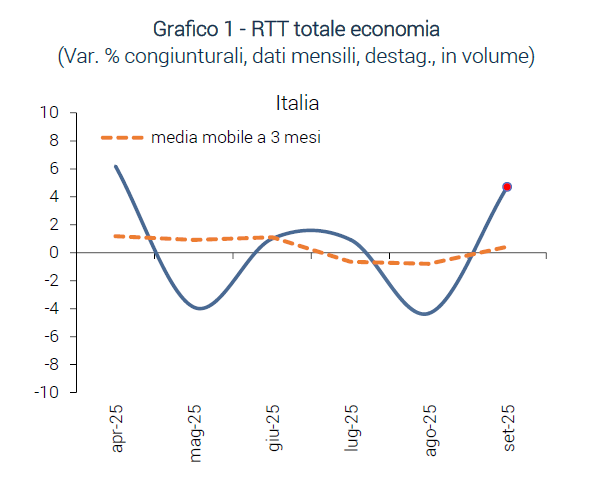 • Nel complesso, RTT indica una variazione negativa, anche se moderata, del fatturato nel 3° trimestre 2025 (-1,1%), a causa del forte calo di agosto.