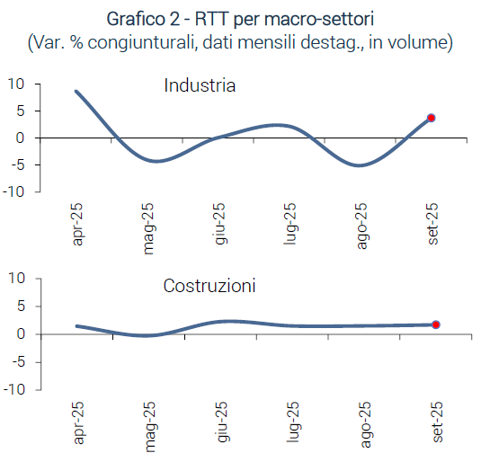 • La risalita di RTT nell’industria a settembre (+3,7%) non è sufficiente a compensare la flessione di agosto (Grafico 2).