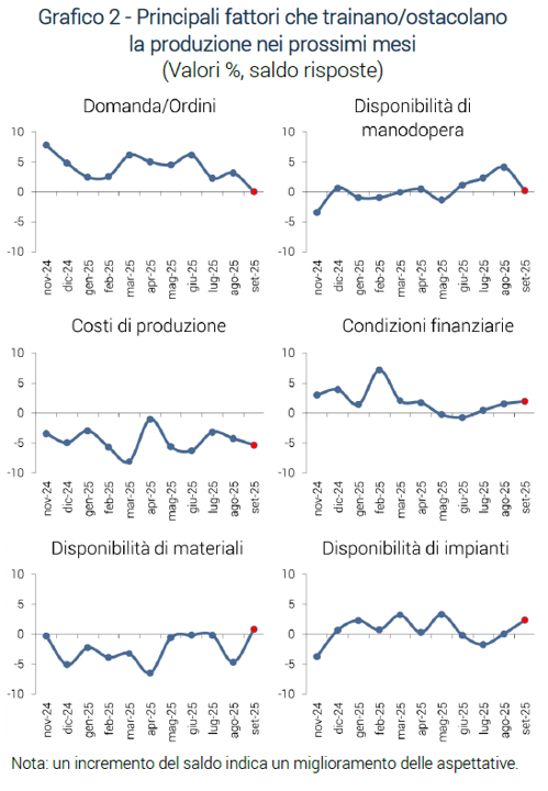 - Il giudizio degli industriali sulla disponibilità degli impianti migliora sensibilmente nella rilevazione di settembre (2,4% da 0,1%).