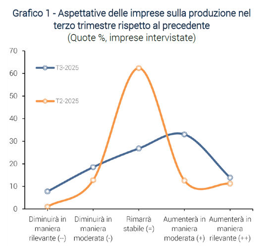 - Osservando l’andamento trimestrale (Grafico 1), nel secondo trimestre del 2025 più della metà degli intervistati prevedeva una produzione invariata (62,4%). Nei mesi estivi le valutazioni si sono distribuite diversamente: nel terzo trimestre, infatti, quasi la metà delle imprese si attendeva un aumento (46,9%), il 26,8% prevedeva una produzione stabile, mentre il 26,3% una contrazione.